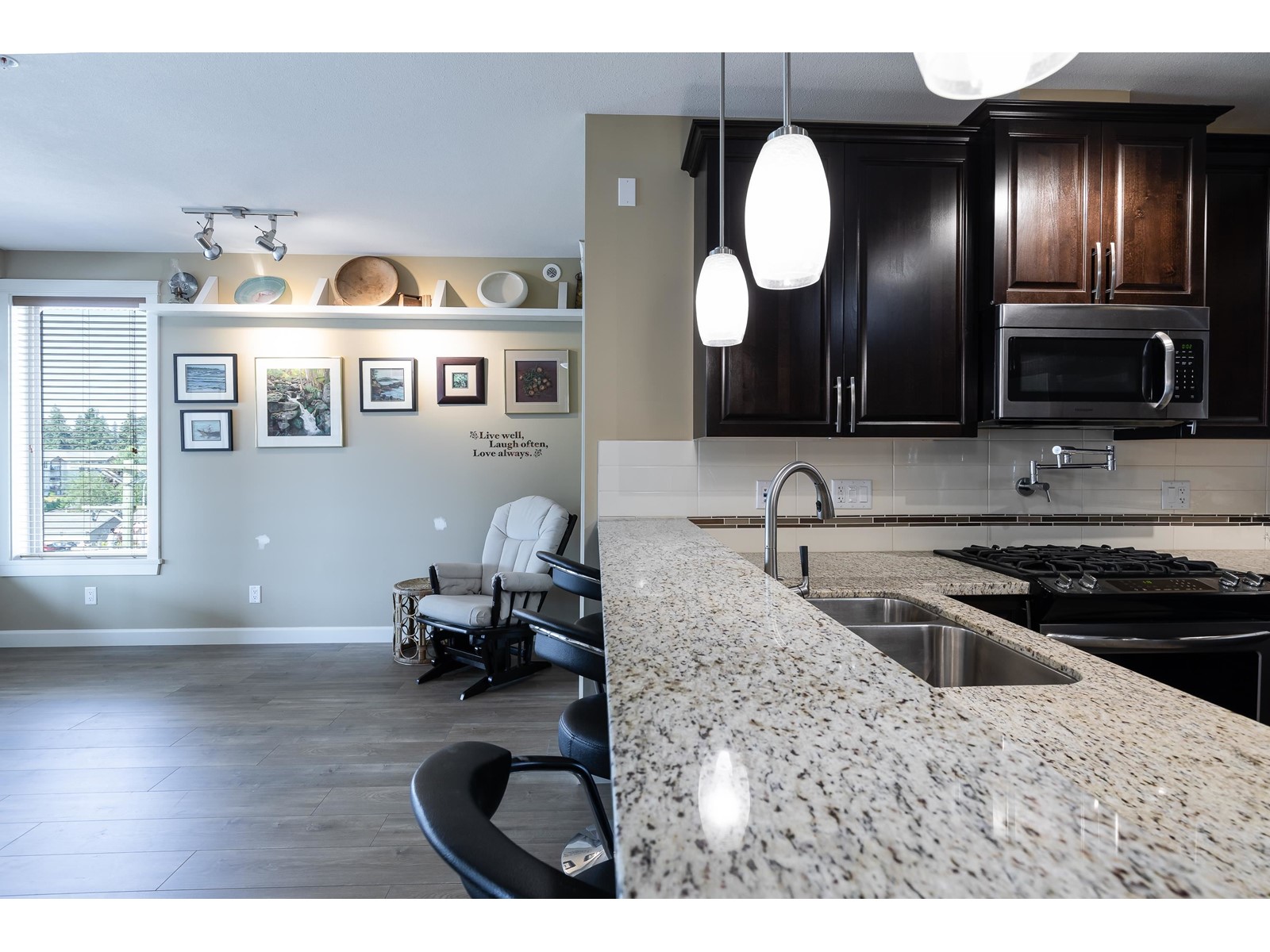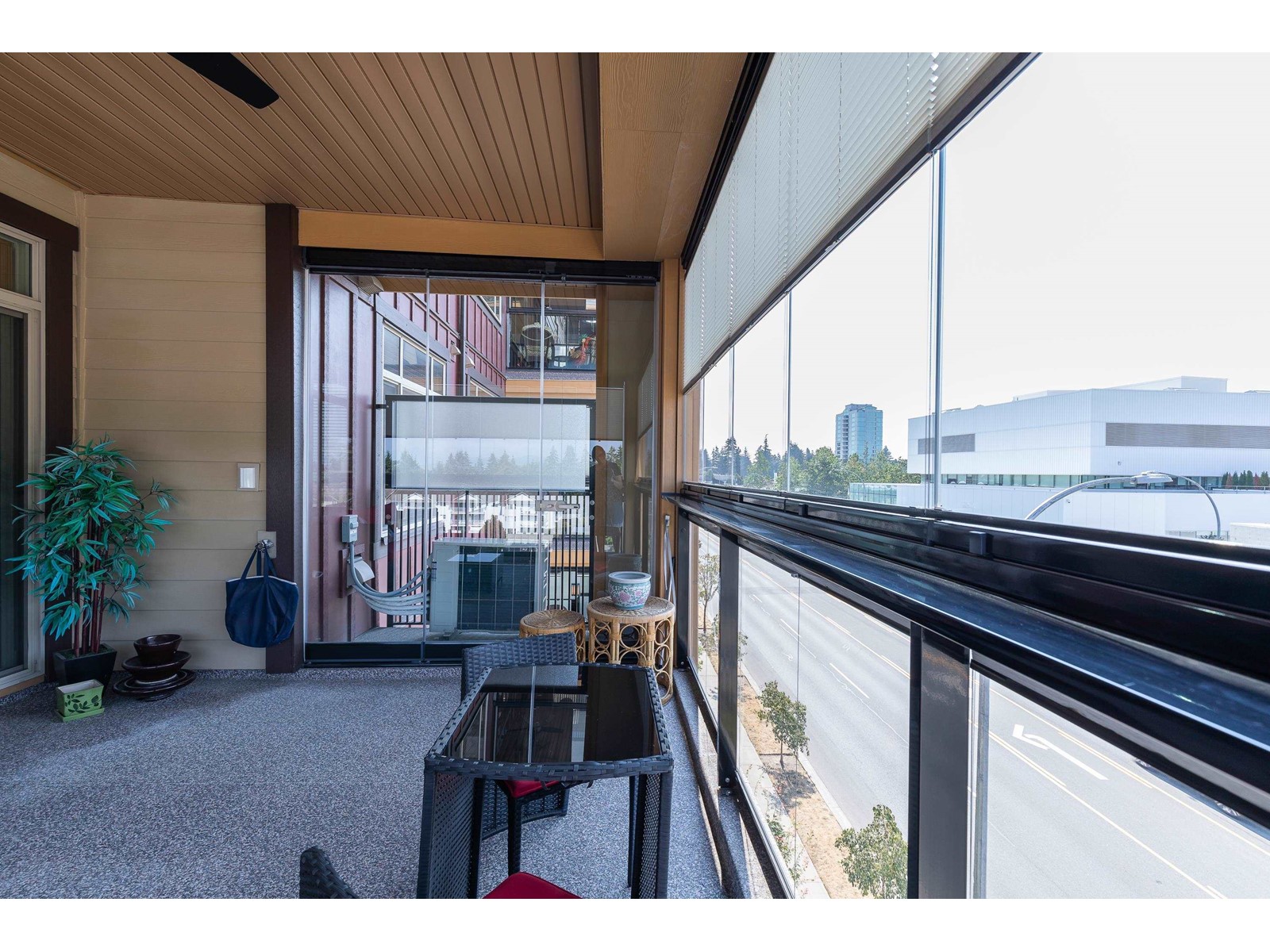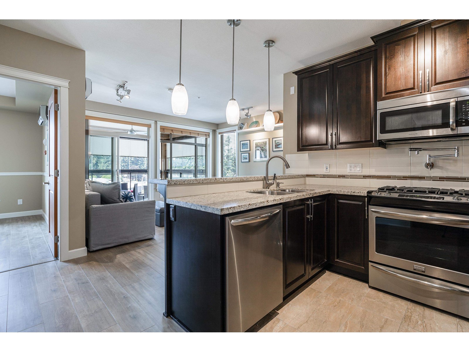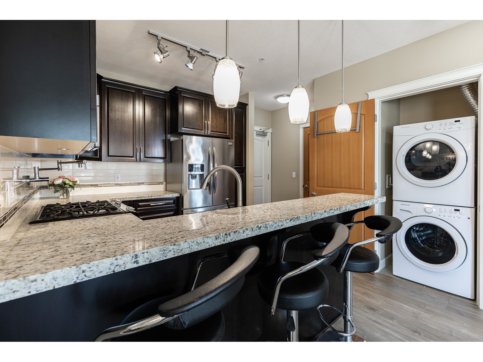 La Galleria - where design meets function. Here's your chance to live in one of Abbotsford's most sought after buildings. Designed with comfort in mind this corner unit has AC/Heating units in the living room and bedroom, built-in closet organizer, heated floors, rain /steam glassed in shower, granite counters, gas range with pot filler, stainless fridge and dishwasher, pull out pantry shelves and the list goes on. Most notable for La Galleria is the extra large solarium with retractable glass panels, blinds, gas BBQ hook-up, hose bib and of course the beautiful views that you can enjoy in comfort year round. You can leave the cars in the secured underground parking because everything like shopping, dining, library and services are just steps away. (id:39665)