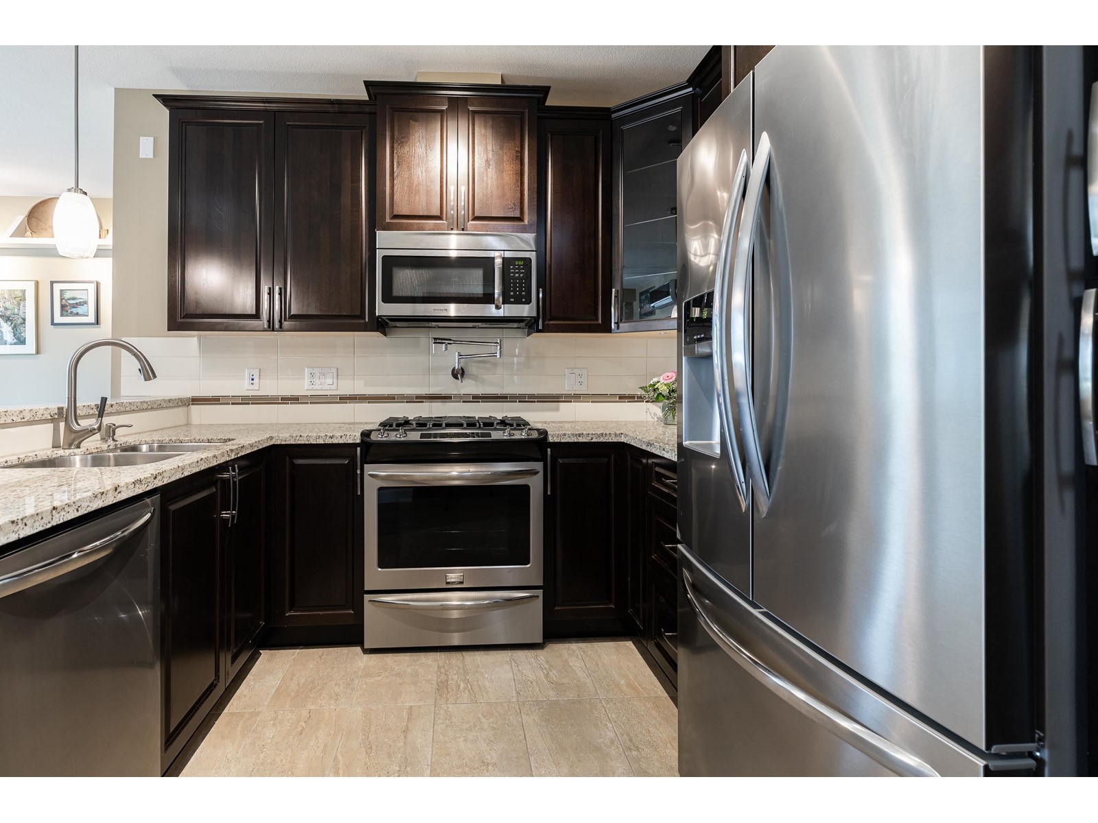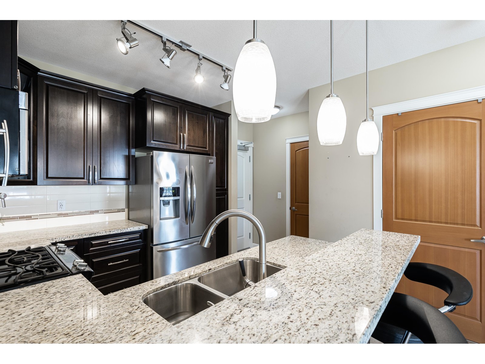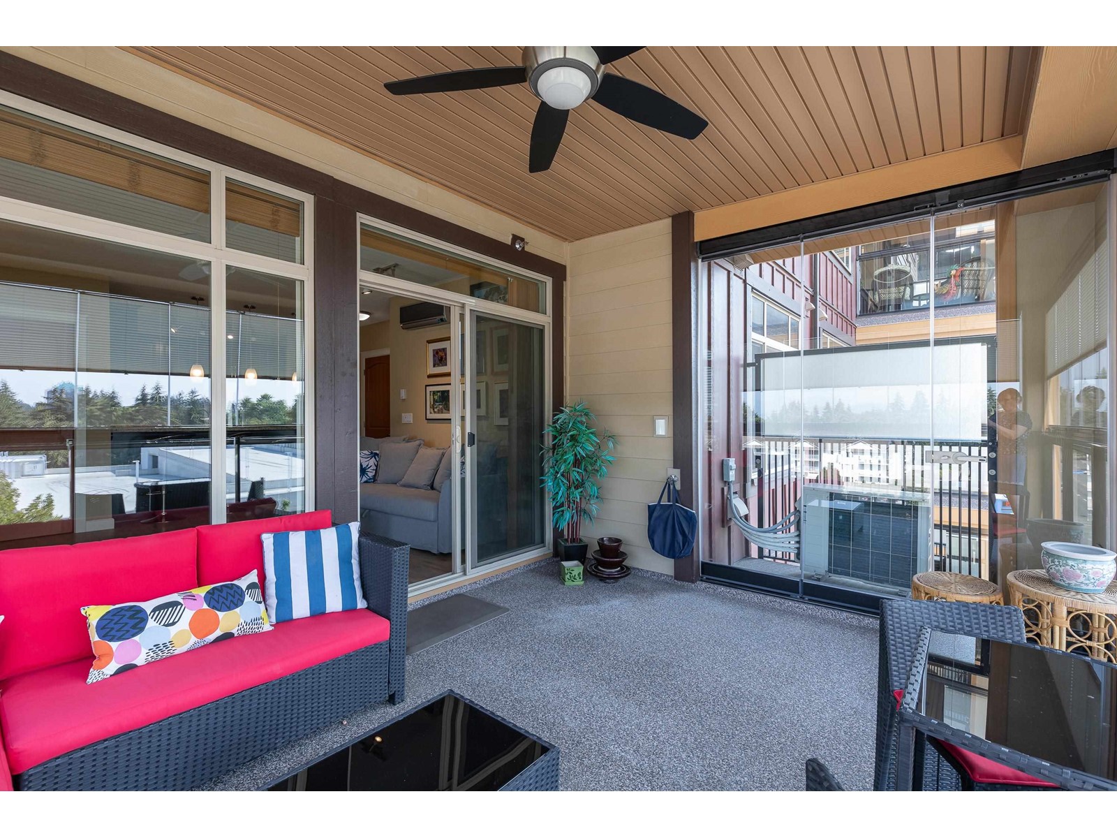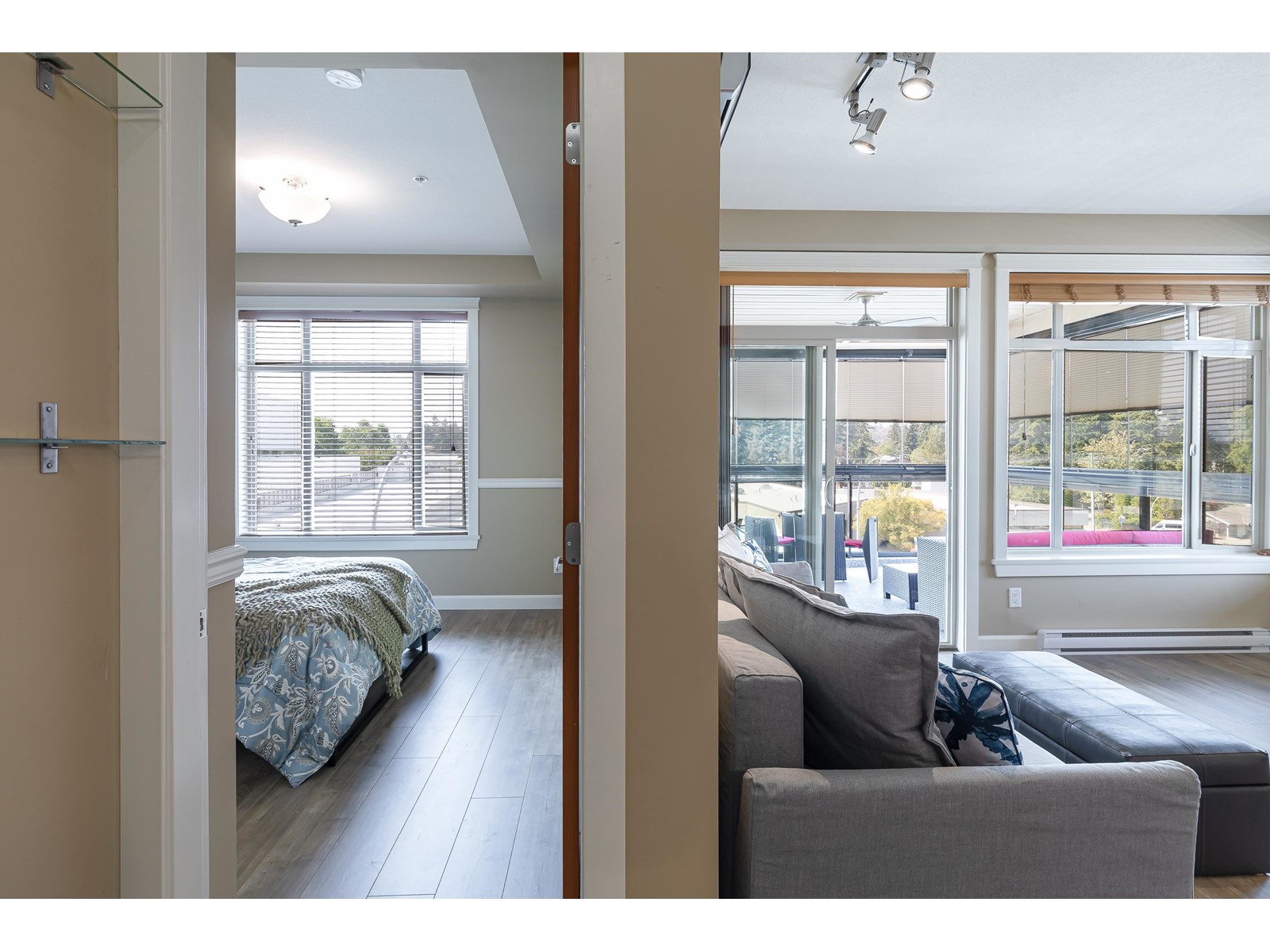 La Galleria - where design meets function. Here's your chance to live in one of Abbotsford's most sought after buildings. Designed with comfort in mind this corner unit has AC/Heating units in the living room and bedroom, built-in closet organizer, heated floors, rain /steam glassed in shower, granite counters, gas range with pot filler, stainless fridge and dishwasher, pull out pantry shelves and the list goes on. Most notable for La Galleria is the extra large solarium with retractable glass panels, blinds, gas BBQ hook-up, hose bib and of course the beautiful views that you can enjoy in comfort year round. You can leave the cars in the secured underground parking because everything like shopping, dining, library and services are just steps away. (id:39665)