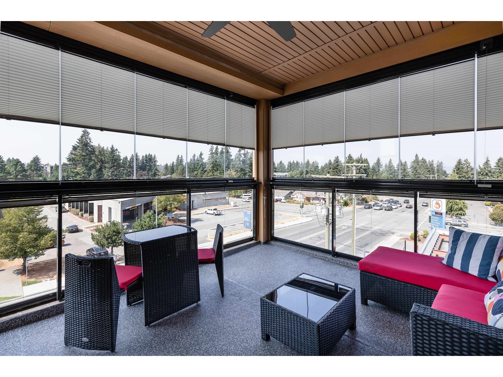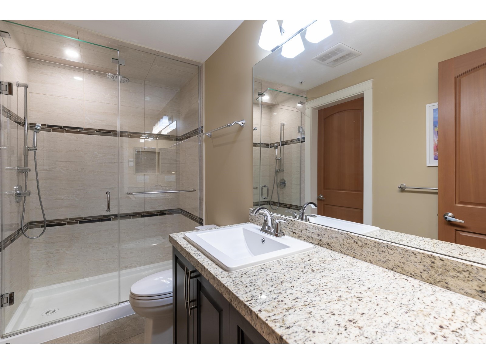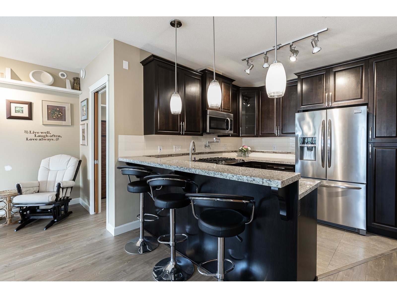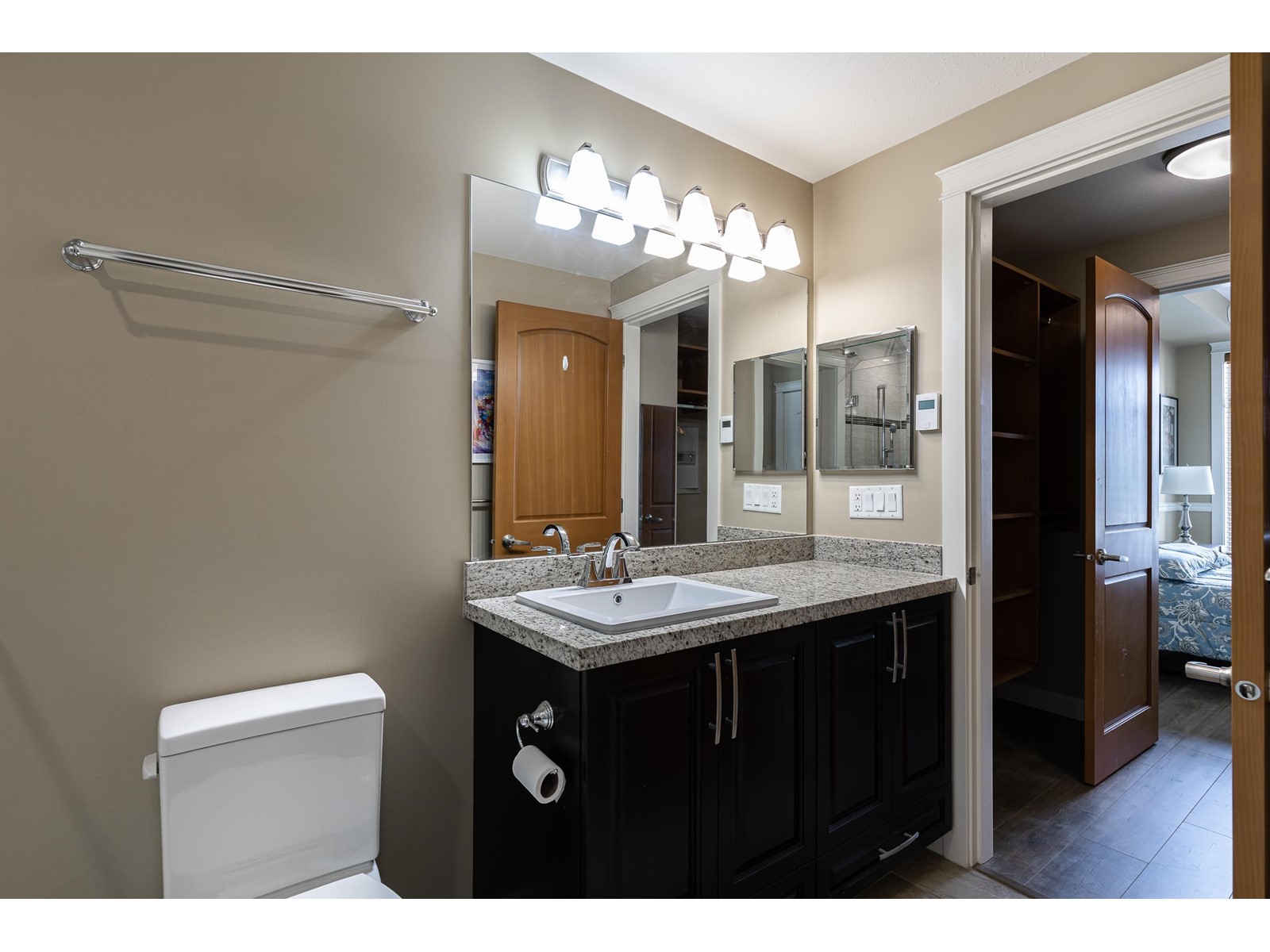 La Galleria - where design meets function. Here's your chance to live in one of Abbotsford's most sought after buildings. Designed with comfort in mind this corner unit has AC/Heating units in the living room and bedroom, built-in closet organizer, heated floors, rain /steam glassed in shower, granite counters, gas range with pot filler, stainless fridge and dishwasher, pull out pantry shelves and the list goes on. Most notable for La Galleria is the extra large solarium with retractable glass panels, blinds, gas BBQ hook-up, hose bib and of course the beautiful views that you can enjoy in comfort year round. You can leave the cars in the secured underground parking because everything like shopping, dining, library and services are just steps away. (id:39665)