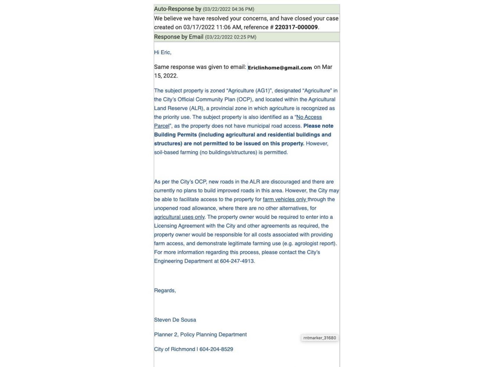 EXCELLENT LONG TERM HOLDING PROPERTY IN McLennan area of Richmond. - No Access road - Land Only in ALR, 0.874 "NO BUILDING is allowed at this time. " acre close to Granville Ave / Alberta Rd between No 4 Road and Shell Road. Currently Wild Blue Berries in place. Please note Building Permits are not permitted to be issued on this property; However, soil-based farming ( no buildings/structures) is permitted. City Require agreement for unopened road access with farming purpose only. (id:39665)